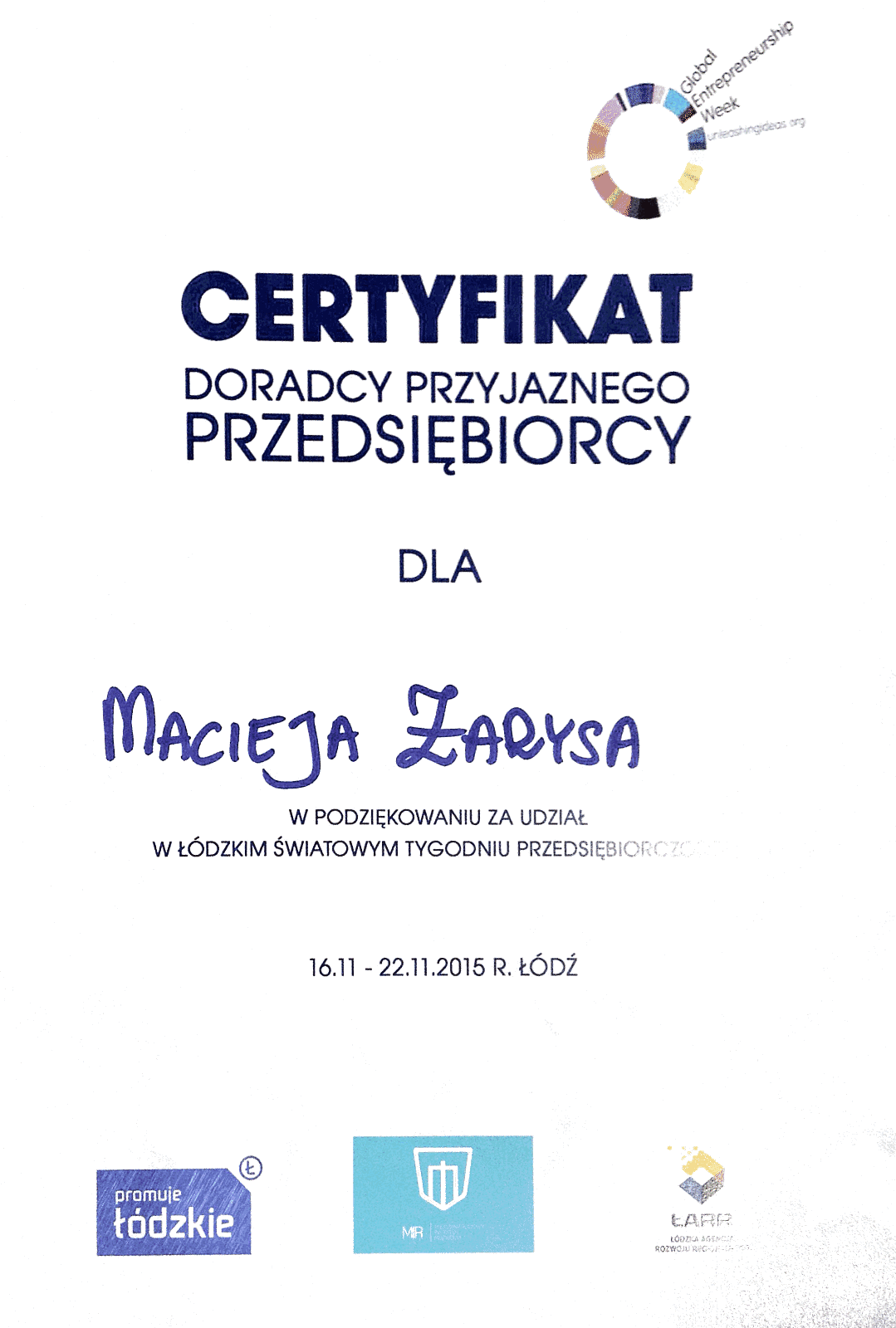 Certyfikat - Światowy Tydzień Przedsiębiorczości